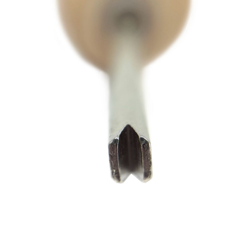Grooved steel tool mounted in wood handle for pushing bezels around stones.