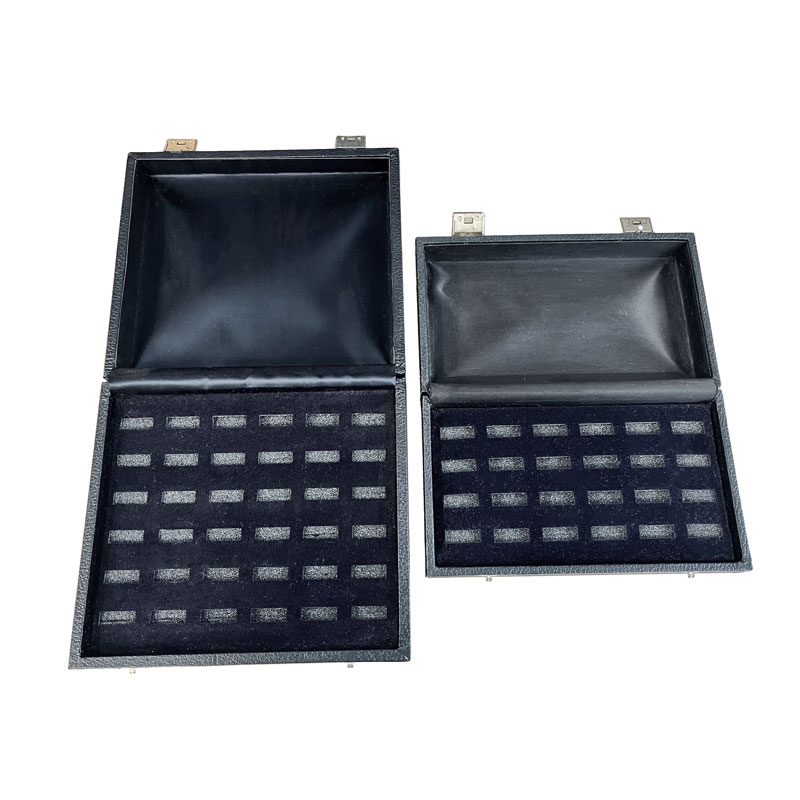 The items in this line include trays and cases for 12, 24, and 36 rings. Cases are wood, covered in textured black vinyl, with simply designed metal latches. Slotted black foam under the velvet inserts hold rings firmly in place.