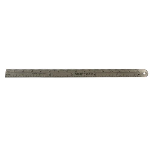Graduated in millimetres across the top and 1/32" increments across the lower half. All graduations are deeply etched. Overall length 6" (150 mm), width 1/2" (12.7 mm).