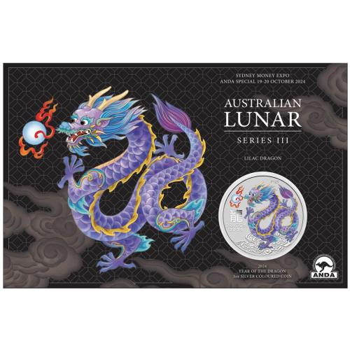 Fine Silver Coin Coloured Lilac Dragon 2024 in Card