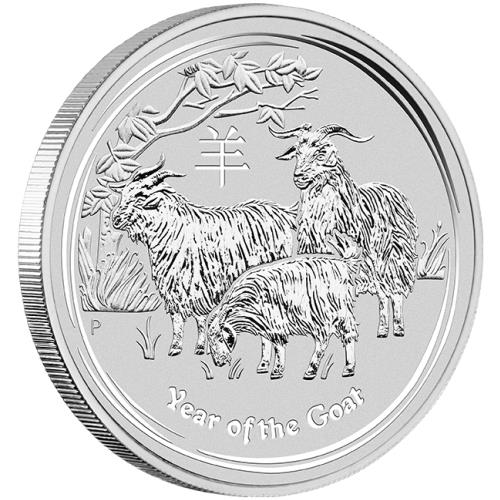 Fine Silver Lunar Coin Goat 2015 5oz Lunar Sign: Goat Year: 2015 Silver Content: 5 Troy oz Minimum Weight: 156.673g Purity: 99.9% Denomination: $8.00 (AUD) Dimensions: 65.6mm x 5.8mm