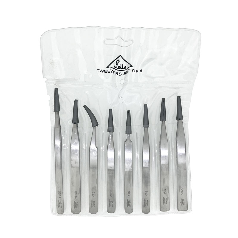 Soldering tweezers in 8 of the most popular shapes and sizes. Made from Stainless steel, Quality with well finished tips. Tweezers are Anti-magnetic and anti-acid. Stella Tweezer types in the set: 3C 7 3 MM AA 1 5 SS Supplied in a plastic pouch.